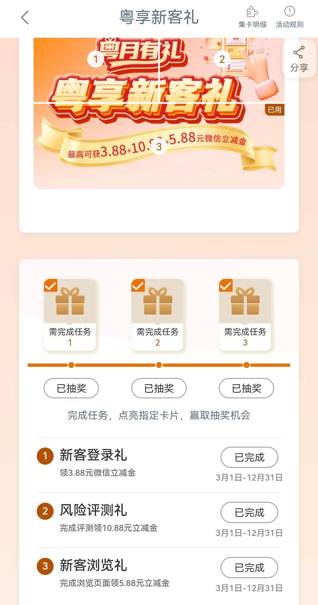 在工商银行APP首页点击任务中心,找到粤享新客礼(可能是限广东地区)按照里面的浏览任务完成即可抽奖,可以在微信闪动小程序无损套现,需要新客
