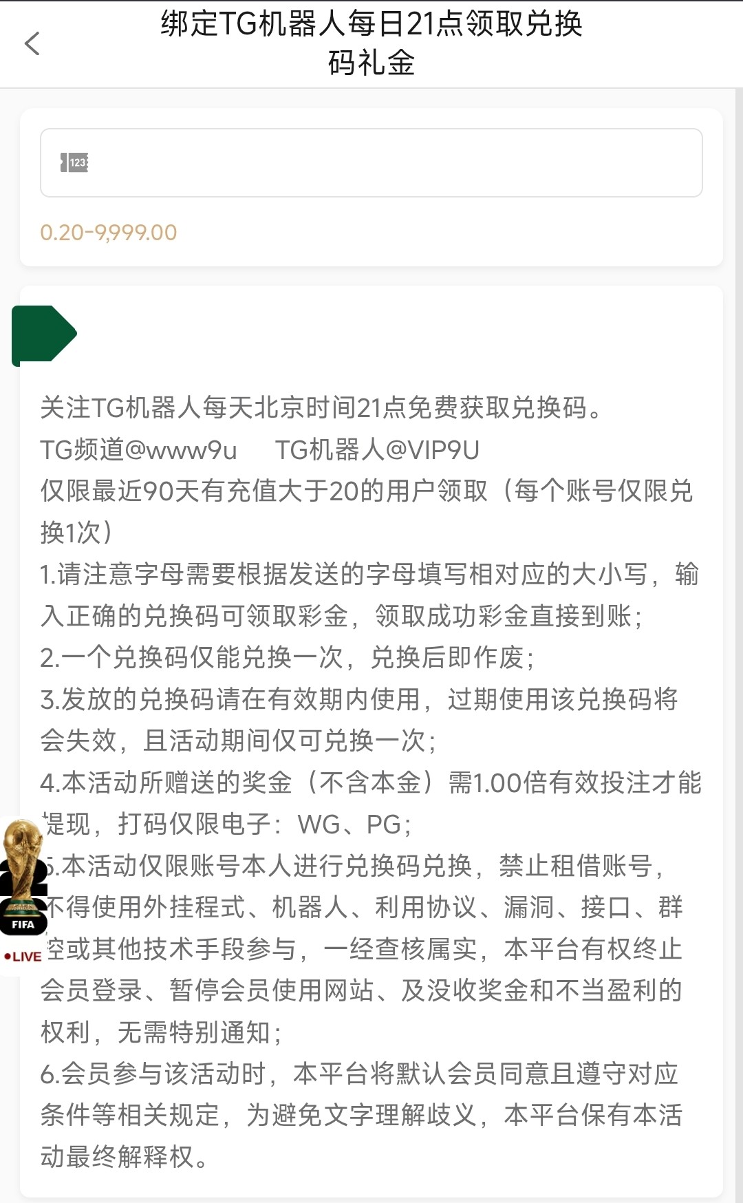 获取的兑换码彩金一倍流水仅限娱乐WG电子/PG电子
