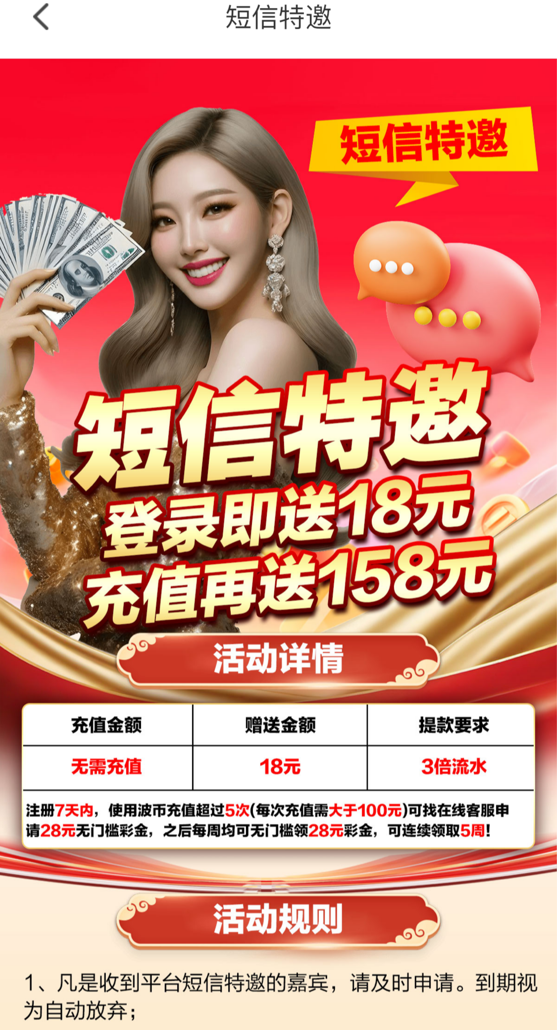 下载好APP注册联系客服申请彩金,不是电话特邀可以在活动里截图短信特邀两个都可以申请,三倍流水